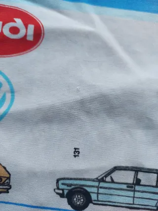 Pañuelo vintage de colección con motivos de coches de las marcas SEAT, Audi y Volkswagen de los años 80. Puede tener algun desgaste como en las fotos 2 y 3 - Diseño con ilustraciones de modelos como Golf, Jetta, Scirocco, Passat, Santana, Audi 80, Audi 100, Audi Quattro y Audi Coupé. - Colores predominantes: azul, blanco, rosa y naranja. - Borde decorativo con líneas azules y rosas.