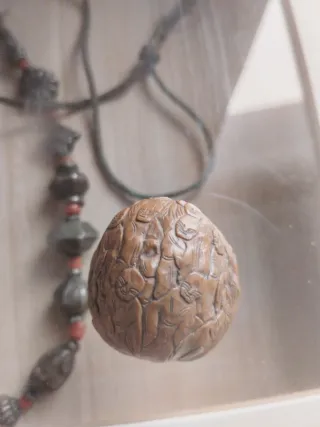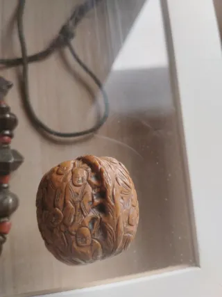 Detalle de una nuez tallada a mano, con un diseño intrincado - Nuez con tallado de figuras.