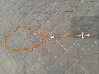Rosario con cuentas de color naranja y una cadena plateada. 45 cm de largo. - Cuentas de cristal. - Cadena metálica. - Crucifijo detallado.