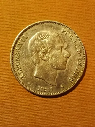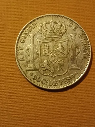 Moneda de 50 centavos de Alfonso XII, acuñada en Manila en el año 1881. - Anverso: Retrato de Alfonso XII. - Reverso: Inscripción POR LA G. DE DIOS y año 1881. - Canto: Estrellas y guirnalda.