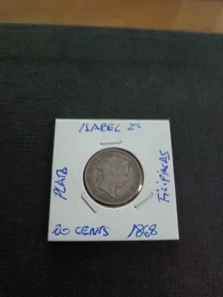 Conjunto de dos monedas de plata de Isabel II. - Monedas de 20 céntimos. - Año de acuñación: 1868. - Emitidas en Filipinas.