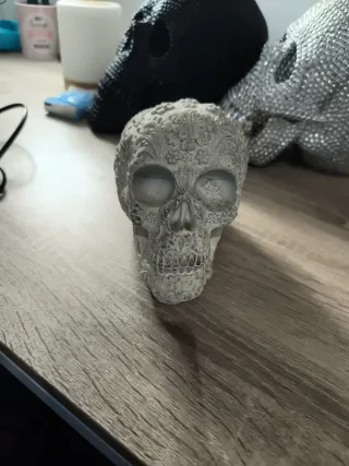 Calavera decorativa con un diseño único y llamativo. Su textura detallada le da un toque especial. - Color: Negro. - Material: Desconocido. - Diseño: Textura de puntos. - Forma: Calavera humana.