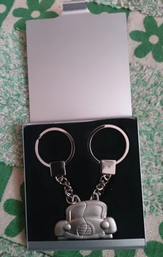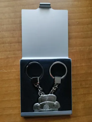 Pareja de llaveros con un diseño de coche dividido. Cada llavero tiene forma de medio coche que encaja con el otro. En estuche de regalo. Completamente nuevo, se compró para un regalo que no cuadró.... Se entrega en Manzanares el Real. También se puede entregar en Madrid en Las Tablas o en la zona de Embajadores. Se hacen envíos.