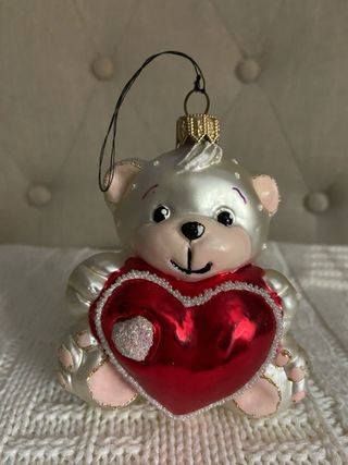 Adorno de Navidad artesanal con forma de oso y corazón. Espectacular adorno navideño de la prestigiosa firma ucraniana Irena Co. (Lviv). No se trata de un adorno industrial de plástico, sino de una auténtica pieza de artesanía tradicional. • Técnica: Vidrio soplado a boca (Mouth blown) y decorado totalmente a mano (Hand decorated). Cada pieza es única. • Origen: Fabricado en Ucrania, región mundialmente reconocida por la calidad superior de sus adornos de cristal. #Regalo #Navidad # Reyes #Artesanía #Coleccionismo # Oso Cristal