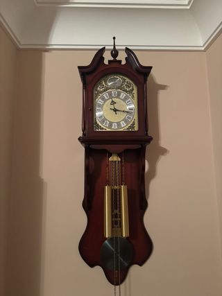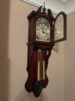 Magnífico reloj de pared Tempus Fugit de maquinaria alemana y un diseño clásico y atemporal. - Caja de madera marrón/rojiza. - Esfera dorada con números romanos. - Péndulo dorado con esfera metal en color gris y pesas doradas. - Logotipo de la marca grabado en metal cepillado y pintura en negro el texto arriba a las doce. - Funcionamiento perfecto. Sonido a la hora con campanadas y media hora una campanada, muy armonioso. Recogida en mano. No se hacen envíos.