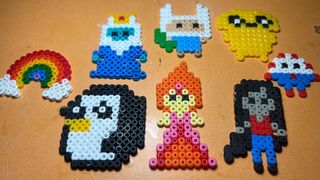 Conjunto de figuras hechas a mano con Hama beads. Cada pieza es única y colorida. Pack entero de hora de aventuras 6€ cada uno seria 1€ - Personajes de dibujos animados. - Arcoíris. - Pingüino. - Diseño de personaje de videojuego.