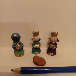 Conjunto de tres figuritas de los Reyes Magos, perfectas para decorar. - Un Rey Mago con turbante azul y traje verde y amarillo. - Un Rey Mago con corona dorada y traje verde. - Un Rey Mago con corona dorada y traje morado. - Recoger en Manzanares el Real