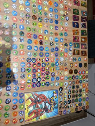 Colección de tazos de diferentes series y diseños. - Tazos de Pokémon. - Tazos de otros personajes. - Variedad de colores y acabados.
