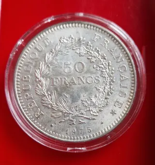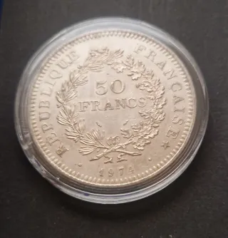 Moneda de plata de 50 francos franceses del año 1975. Presenta un diseño con laureles y el valor nominal. - Material: Plata 900 Pesa 30 Gramos y lleva 27 gramos de plata pura. - Año: 1975 - Denominación: 50 Francos - País: Francia