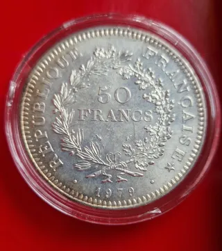 Moneda de plata de 50 francos franceses, acuñada en el año 1978. - Pesa 30 Gramos de plata 900 y lleva de plata pura 27 Gramos. - Diseño con laureles y detalles. - Pais Francia