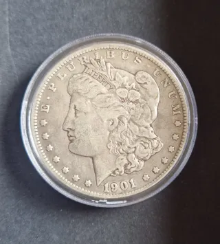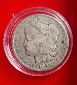 Moneda de plata Morgan de Estados Unidos acuñada en el año 1901. - Diseño de Lady Liberty. - Canto con estrellas y leyendas. - Material: Plata.