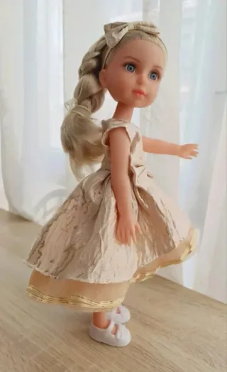 Muñeca de vinilo de 35 cm, rubia, ojos azules, con un precioso vestido dorado de fiesta con volantes y diadema a juego. ¡Nueva a estrenar! Ideal para coleccionistas o como regalo especial. Similar a Paola Reina, Ruby Red Fashion Friends, Naia o Simona. Echa un vistazo a mi perfil, ¡tengo más modelos con vestidos de fiesta disponibles! Se envía protegido y con mucho mimo 🌻