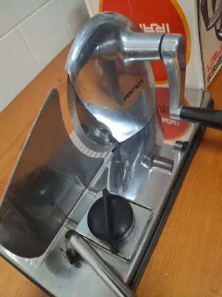 Cortafiambres manual de la marca IRAMEN, con un diseño clásico de los años 70 u 80. Su estructura es de metal pulido y cuenta con un asa para su funcionamiento. - Fabricado en metal. - Diseño vintage.