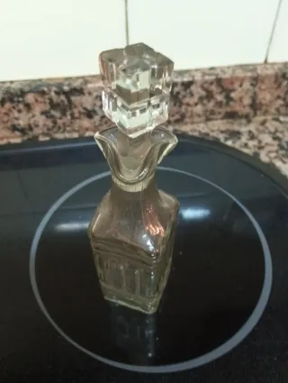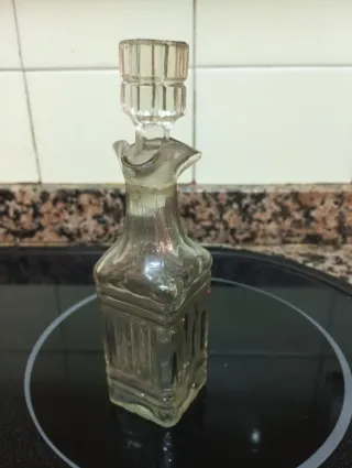 Pequeña aceitera de cristal con un diseño clásico. - Material: Cristal. - Diseño: Rectangular con detalles. - Tapón: Incluye tapón de cristal. En perfecto estado