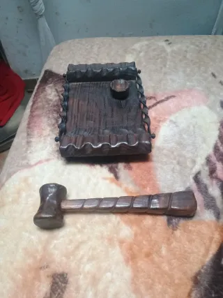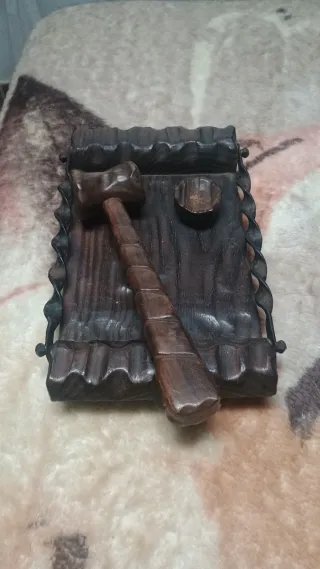 Antiguo cascanueces de madera tallada. - Diseño rústico. - Incluye un pequeño cuenco. - Mango con detalles.