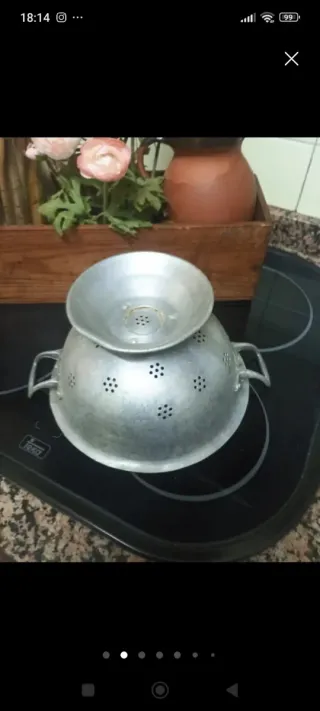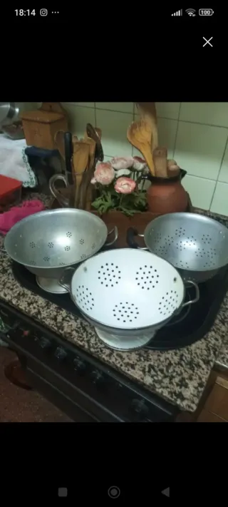 Conjunto de tres escurridores de cocina de estilo antiguo. Perfectos para añadir un toque vintage a tu cocina. - Material: Metal y esmalte. - Diseño clásico con asas. - Ideal para escurrir pasta, verduras y frutas.precio unidad 13€ ideal decoración rústica reciclar ♻️ en lampara o usar como tal