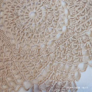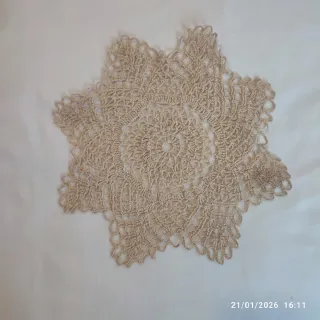 Bonito mantel individual hecho a mano con hilo de ganchillo en tono beige. Su diseño intrincado y forma estrellada lo hacen ideal para decorar. - Material: Hilo de ganchillo. - Color: Beige. - Diseño: Estrellado con detalles calados.