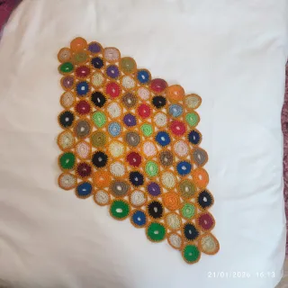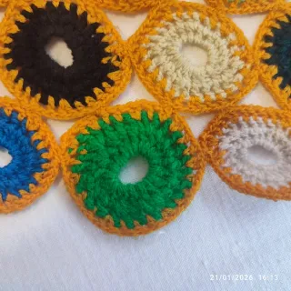 Tapete artesanal de ganchillo con un diseño de círculos multicolores sobre fondo naranja. - Hecho a mano con hilo. - Múltiples colores vibrantes. - Forma triangular.