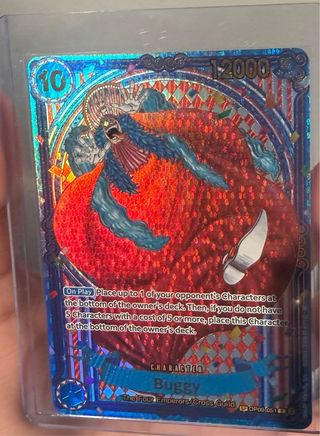 Carta de personaje de Buggy, The Four Emperors/Cross Guild. PRECIO NEGOCIABLE - Coste 10. - Poder 12000. - Efecto On Play: Coloca hasta 1 de los Personajes de tu oponente en la parte inferior de la baraja del propietario. Luego, si no tienes 5 Personajes con un coste de 5 o más, coloca este Personaje en la parte inferior de la baraja del propietario. - Código: SP OP09-051.