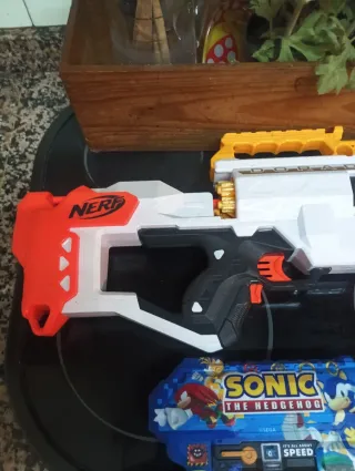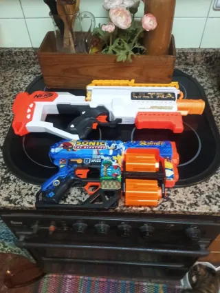 Se venden dos pistolas Nerf de colección, un modelo grande y otro con diseño de Sonic. - Pistola Nerf Ultra. - Pistola Nerf Sonic The Hedgehog. - Ambas son de gran tamaño.
