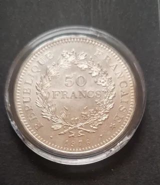 Moneda de 50 francos de plata de Francia, acuñada en el año 1976. - Diseño con laureles y el valor nominal. - Inscripción République Française alrededor del borde.