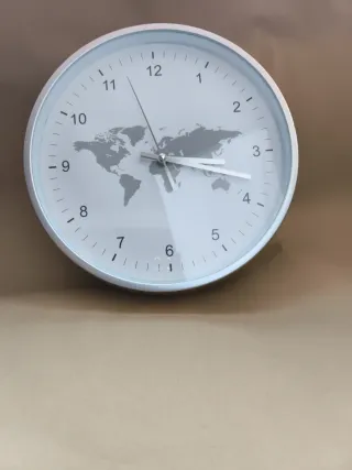 Reloj de pared con un diseño original de mapa mundi. - Esfera blanca. - Marco plateado. - Diseño del mapa en gris.