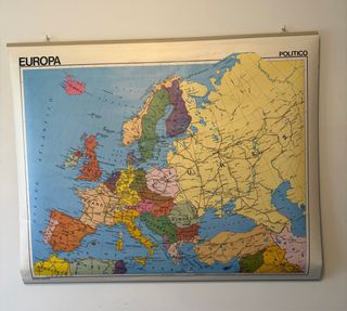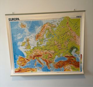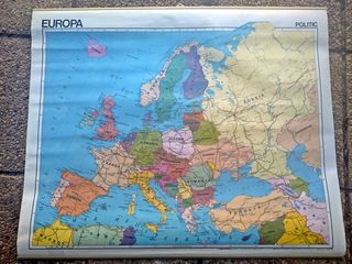 Mapa mural físico , por una cara y político, por la otra, de Europa Este mapa tiene mas de 40 años aunque nunca se uso (conservo el tubo de envase) Europa cambio mucho desde entonces asi que no sirve como material didáctico, mas bien como pieza de colección o decoración Esta fabricado en papel blanco, lavable y antireflectante Medida: 93 x 113 cms.