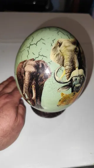 Pieza de coleccionista exclusiva. Se vende huevo de avestruz auténtico, originario de Sudáfrica, adquirido aproximadamente entre los años 2001 y 2003. Este ejemplar destaca por su detallada decoración artesanal, que incluye: Anverso: Una impresionante composición de "Los 5 Grandes" (León, Leopardo, Elefante, Rinoceronte y Búfalo africano). Reverso: Un mapa antiguo detallado del continente africano. Laterales: Escenas adicionales de fauna salvaje (elefantes y rinocerontes en su hábitat). Acabado: Efecto craquelado envejecido sobre fondo verde suave, que le aporta un toque vintage y elegante. Estado: Muy bien conservado. Es una pieza