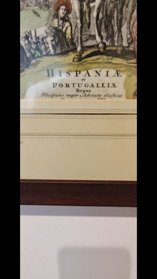 Mapa antiguo original “Hispania et Portugallia Regna”, enmarcado. No es reproducción. Pieza decorativa y de colección, ideal para despacho, biblioteca o interior clásico. Buen estado general, con el desgaste propio de la antigüedad. Se vende en Madrid. Más fotos y detalles por privado. - Representación detallada de la península ibérica. - Marco de madera oscura.