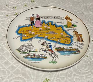 Plato decorativo con mapa de Menorca y sus lugares de interés. - Ilustración de la isla con nombres de calas y pueblos. - Figuras de pareja vestida de época. - Dibujos de monumentos y paisajes. - Borde dorado. Medida 24,5