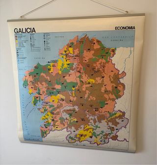 Mapa mural físico-político de Galicia, por una cara y económico, por la otra Fabricado en papel blanco, lavable y antireflexivo Este mapa tiene mas de 40 años, aunque nunca se uso. Durante este tiempo las cosas fueron cambiando o evolucionando asi que la información didáctica puede que no sea del todo correcta Será ideal como pieza de colección o decoración Medida: 88 x 94 cms. (Conserva el tubo del envase, que mide: 95x 130 cms.)
