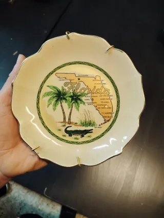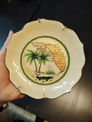 Plato decorativo con un mapa de Florida y sus ciudades principales. - Diseño con palmeras y un cocodrilo. - Borde festoneado con detalles dorados. - Incluye colgadores para pared.