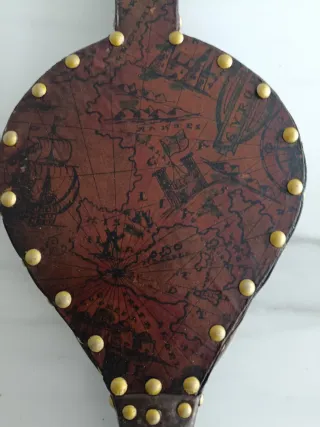 Fuelle decorativo con un diseño de mapa antiguo. - Material: Cuero y madera. - Detalle de remaches dorados. - Diseño de mapa histórico. Mide 47cm de largo. Funciona perfectamente. No Esta rota la piel. Está en buenas condiciones.
