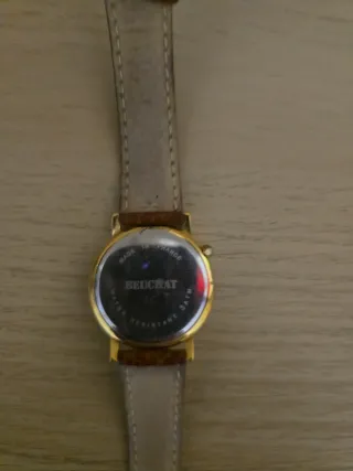 Reloj vintage de la marca Beuchat con un diseño náutico. - Correa de cuero marrón. - Esfera con mapa y detalles en rojo y blanco. - Bisel dorado. No se aceptan devoluciones!hay que poner le pila!