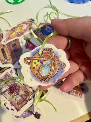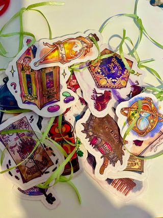 Conjunto de adornos inspirados en el mundo de Harry Potter. 13 adornos - Adorno de Felix Felicis. - Caja de Grageas Bertie Bott. - Caja de Chocolate Frog. - Poción de Felix Felicis. - Mapa del Merodeador. - Botella de Firewhisky. - Criatura con múltiples ojos. - Giratiempo. - Peine.