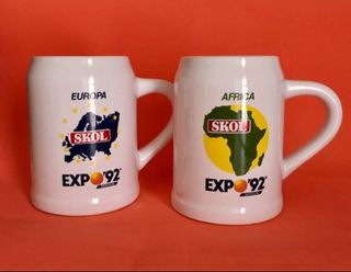 Conjunto de dos tazas conmemorativas de la Expo '92 de Sevilla. Cerveza Skol - Taza Europa con mapa de Europa y estrellas. - Taza África con mapa de África sobre fondo amarillo. - Ambas presentan el logo de Skol y Expo '92 Sevilla.