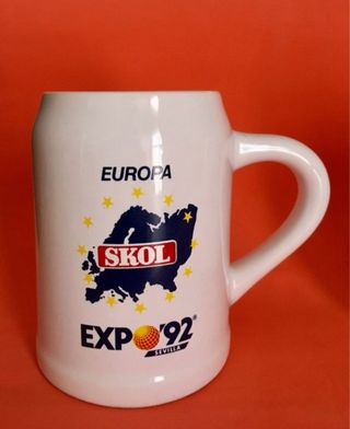 Jarra de cerveza conmemorativa de la Expo '92. - Diseño blanco con mapa de Europa. - Logo de SKOL. - Inscripción EXPO '92.