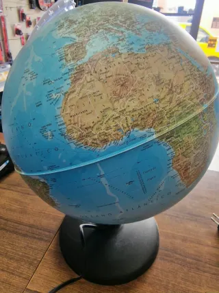 Globo terráqueo con soporte e iluminación. - Mapa político de continentes y países. - Base de plástico negro. - Aro de soporte con escala de latitud. 40 cm de altura