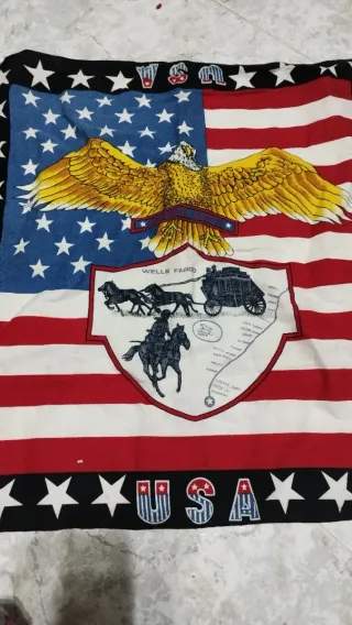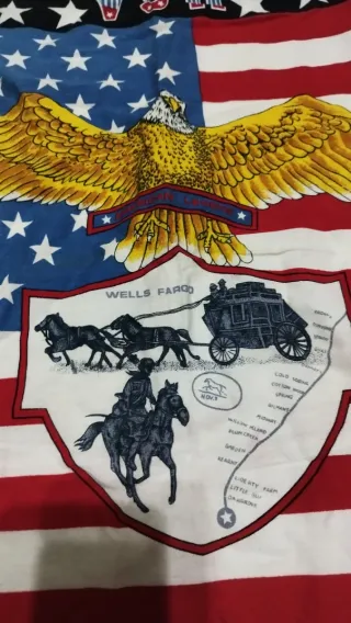 Diseño patriótico con la bandera de Estados Unidos, un águila majestuosa y una escena del viejo oeste. - Ilustración de un águila con las alas extendidas. - Carruaje de Wells Fargo tirado por caballos. - Jinete a caballo. - Mapa de ruta con nombres de lugares.