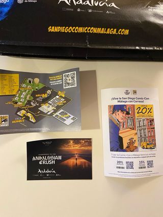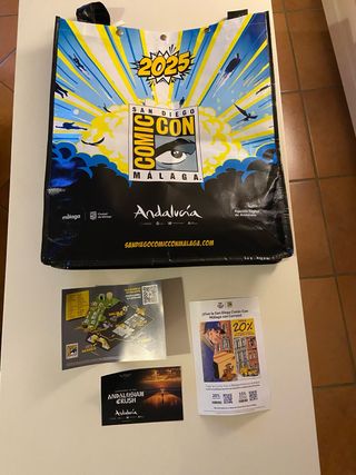 Bolsa de tela conmemorativa de la Comic Con Málaga 2025, junto con varios folletos informativos del evento. - Diseño llamativo con temática de cómics y superhéroes. - Incluye mapa del evento y folleto promocional. - Ideal para coleccionistas y fans de la cultura pop.