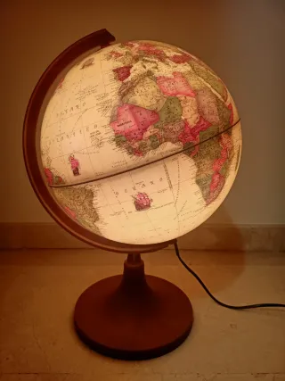 Lámpara de globo terráqueo de los años 90, fabricada en Dinamarca, con referencias escritas en español. Está en perfecto estado y funciona correctamente, en las fotos la enseño encendida y apagada. Los mapas son muy detallados y nítidos, están señalados paralelos y meridianos, corrientes marinas, y otros datos de interés. Útil como lámpara, para decoración y como herramienta de estudio.
