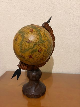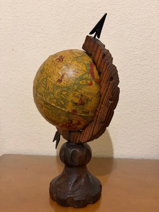 Globo terráqueo de estilo vintage, con base y detalles de madera. - Diseño antiguo. - Soporte de madera tallada. - Mapa detallado con representaciones de barcos.
