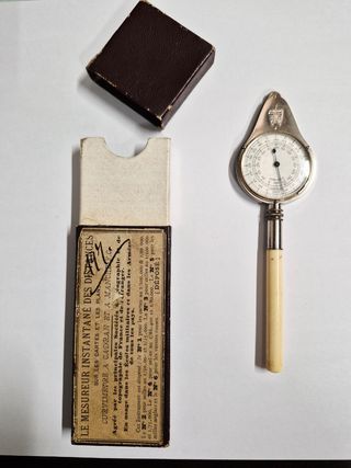 Este es un curvímetro u opisómetro antiguo, un instrumento mecánico utilizado para medir distancias curvas y rectas en mapas y planos, data aproximadamente de principios del siglo XX, con estimaciones que varían entre 1900 y 1920. En perfectas condiciones. La caja presenta señas de su antigüedad pero está en buenas condiciones. Perfecto para un regalo o para coleccionistas.