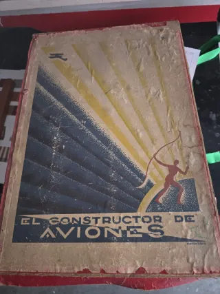 Maqueta de madera antigua titulada El Constructor de Aviones. Un objeto de colección con un diseño retro. - Diseño gráfico vintage. - Ilustración de un hombre con un arco y un avión. - Texto El Constructor de Aviones en la portada.