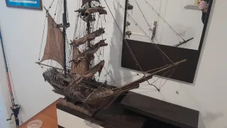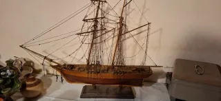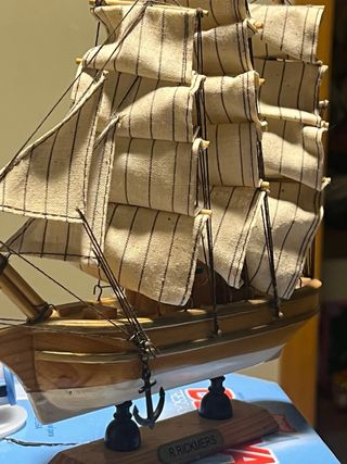 Detallada maqueta de un barco de madera, ideal para coleccionistas o amantes del modelismo naval. - Construcción en madera. - Velas de tela. - Mástiles y aparejos detallados.
