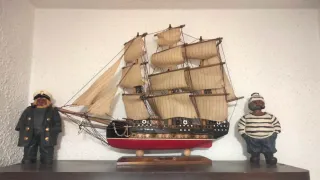 Detallada maqueta de un barco de vela, tipo fragata. Ideal para coleccionistas o amantes de la historia naval. - Casco de madera pintado en azul oscuro y verde. - Mástiles y velas de tela con aparejo. - Base de madera con placa identificativa.