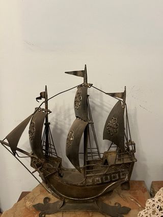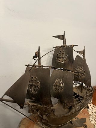 Detallada maqueta de un barco velero, elaborada en metal con técnica de forja. Su diseño vintage le confiere un aire clásico y elegante. - Material: Metal forjado. - Estilo: Vintage. - Decoración: Detalle de cruces en las velas.