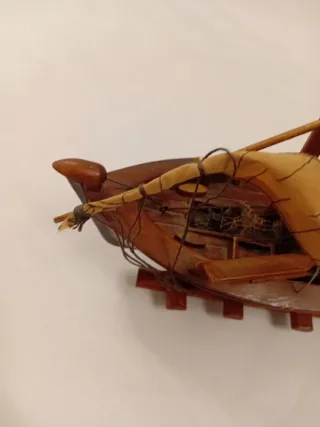 Detallada maqueta de un barco de madera, ideal para coleccionistas o como elemento decorativo. En buen estado, se aceptan ofertas. Mide 24x22x5. - Construcción en madera. - Velas de tela. - Base de exposición incluida.