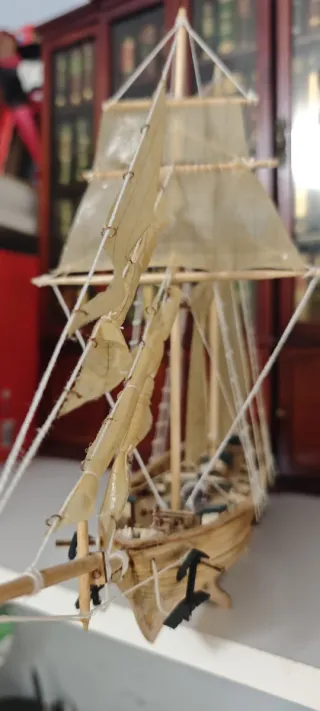 Tiene bastantes años, creo que es de los 80, está en buen estado, creo que le falta una pieza sobre la cubierta pero no estoy segura. Se ve todo en las fotos. Detallada maqueta de un barco de madera con velas de tela. - Construcción en madera. - Velas de tela con diseño a rayas. - Mástiles y aparejos detallados.