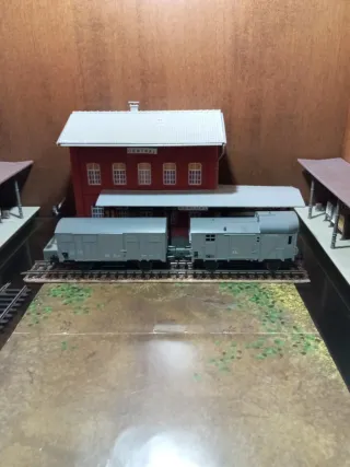 Set de dos vagones de mercancías cerrados en escala HO. Ideales para maquetas de tren. El precio es de los dos vagones. - Dos vagones de mercancías. - Escala HO.